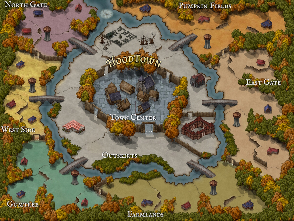 Inside the protective barrier, life flourished in a harmonious blend of old-world charm and modern innovation. The only entrance to HoodTown was a treacherous path that wound its way through the dense forest, leading to a river teeming with ferocious rapids, before having a small window to safely get ashore on the banks of North Gate. At the entrance of the river awaited a swirling whirlpool ☠️ deathtrap, a natural guard that threatened to swallow whole anyone who dared to underestimate its power.